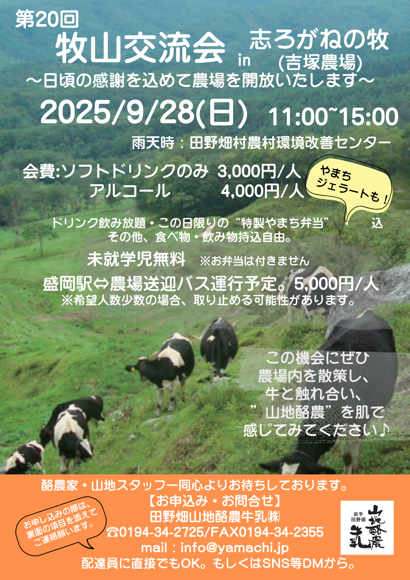 2年ぶりに開催決定いたしました!!今回でなんと20回目となります。 『牧山交流会』 生産者と消費者の皆様で直接顔を合わせての交流会。くがねの牧(熊谷農場)と志ろがねの牧(吉塚農場)田野畑村に有るこの2箇所の農場を交互に会場とし、県内外から多くのお客様にご参加頂いて開催して参りました。 山地酪農牛乳が生まれる生産現場を開放!2軒の農場生産者や弊社会長、社長はもちろんスタッフで皆さまをお迎えいたします。 今年の会場は 志ろがねの牧 吉塚農場 約50年前、千葉からの移住を決断し、大学の先輩である故熊谷隆幸氏を頼って田野畑村へやってきた会長。子供の頃の思いや移住当時の心境、熊谷家での思い出エピソードなども踏まえつつ、牛と共に開拓した農場を会長自らご案内させて頂きます。 またこの日限りの山地牛を使用した”特製やまち弁当”と”山地ジェラート”をご用意いたします! そして!!第20回目の目玉企画は、じゃんけん大会!豪華景品は、弊社自慢の”乳製品詰め合わせ”や”白仙”など!! ☔雨天時は農場から約10分の場所にあります施設にて、生産者と消費者の皆さまとの交流の場を設けたいと考えております♪ 盛岡駅⇔農場への送迎バスも運行予定です!※希望者少数の場合、取り止める可能性があります。 この機会に是非、農場内を散策し、伸び伸び過ごす牛たちと触れ合い、”田野畑山地酪農”を肌で感じてみませんか? 定期のお客様はもちろんの事、弊社の製品を飲んだ事食べた事のある方も無い方も、山地酪農にご興味ある方、どなたでもご参加頂けます! 日時:2025/9/28(日) 11:00~15:00会場:☀志ろがねの牧(吉塚農場)下閉伊郡田野畑村蝦夷森161-3 ☂田野畑村農村環境改善センター 田野畑村尾肝要(おかんよう)121 会費:ソフトドリンク 3,000円/人 アルコール 4,000円/人飲み放題、特製やまち弁当、山地ジェラート付き 未就学児無料 ※お弁当は付きません。 盛岡駅⇔会場の送迎バス:5,000円/人 ご質問やお問い合わせ等は電話、メール、SNSのDMより。※配達員へ直接お声がけ頂いてもOKです。